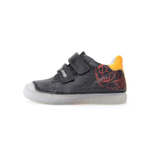 Pantofi pentru copii din piele, interior și exterior, pe talpă din cauciuc flexibil și rezistent. Partea din față a tălpii protejează degetele. Ușor de încălțat, cu închidere prin două benzi velcro.